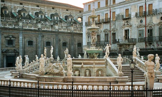 Il suo vero nome è Fontana Pretoria, ma i siciliani la chiamano Fontana della Vergogna per le nudità delle statue che la compongono: è uno dei simboli più rappresentativi della città.