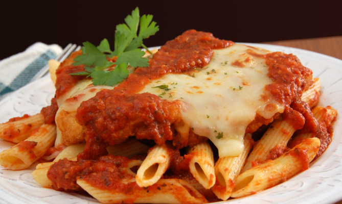 Chiamatelo Chicken Parmesan, o semplicemente Parmigiana di pollo. Questo piatto, molto famoso in Australia, fonde insieme la tradizione italiana con la modernità/praticità/golosità americana. Si compone di un un petto di pollo sbriciolato e impanato, poi condito con salsa di pomodoro e mozzarella, formaggio parmigiano o provolone. A discrezione del cuoco, invece, una fetta di prosciutto o di pancetta, anche se quest'idea fa storcere il naso a tanti americani. Figuriamoci a noi italiani.